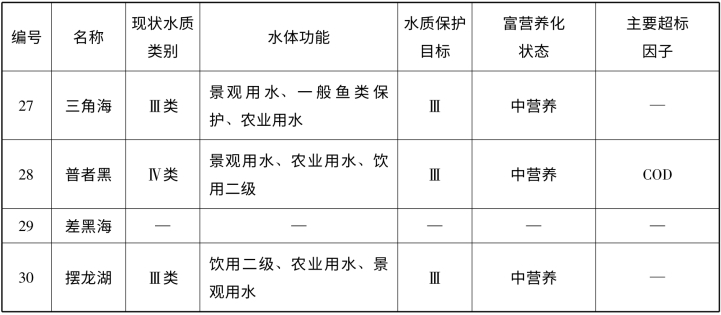 三十个天然湖泊中,除差黑海数据缺失外,仅抚仙湖、泸沽湖两个湖泊现状水质类别为Ⅰ类;现状水质类别为Ⅱ、Ⅲ、Ⅳ和Ⅴ类的湖泊数量分别有五个、八个、五个、四个;劣Ⅴ类的湖泊数量有五个,均属于九大高原湖泊。各个湖泊的现状水质类别详见表5-1。