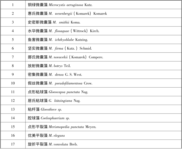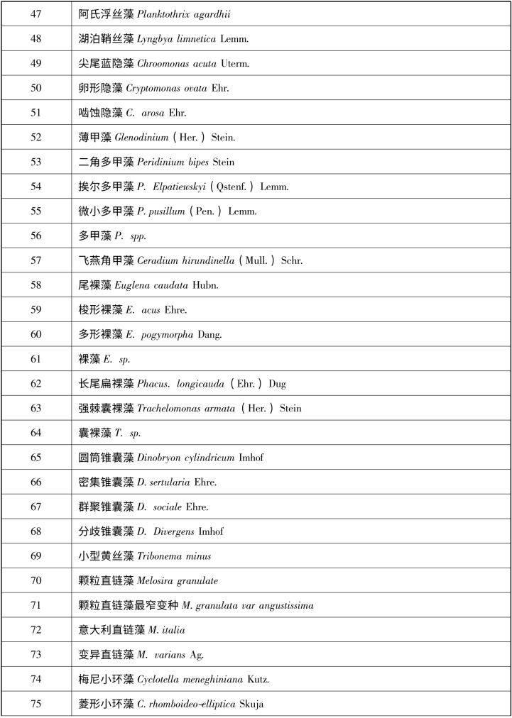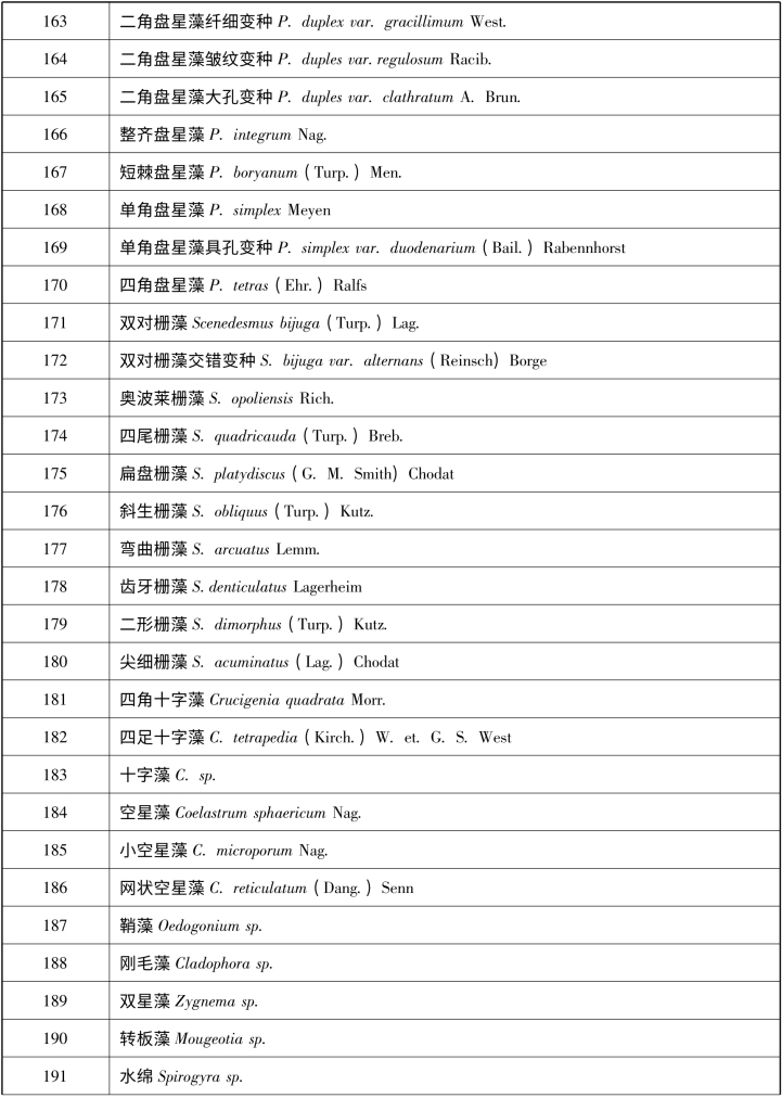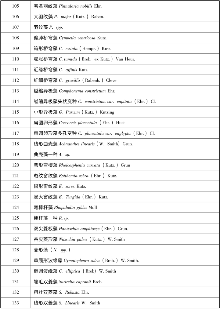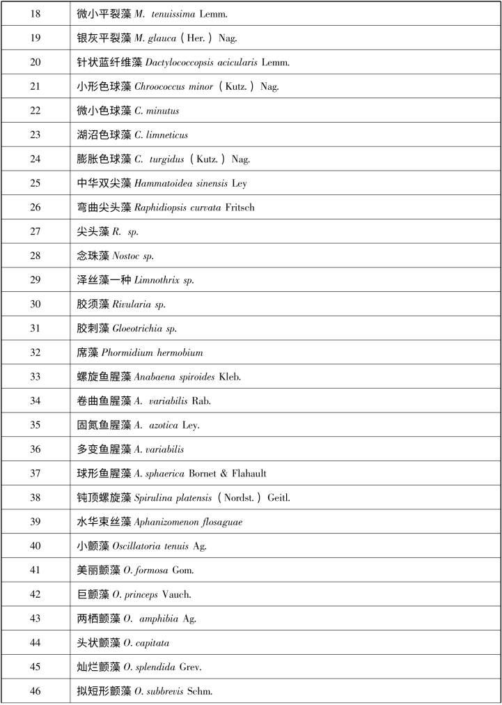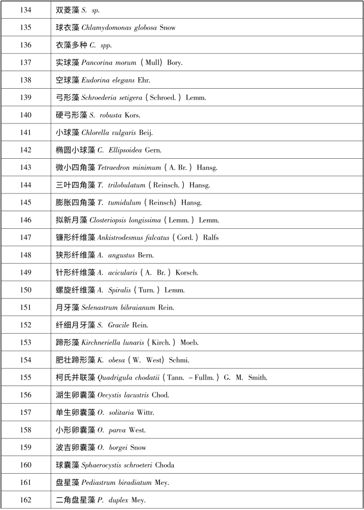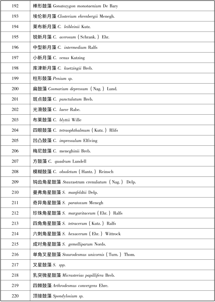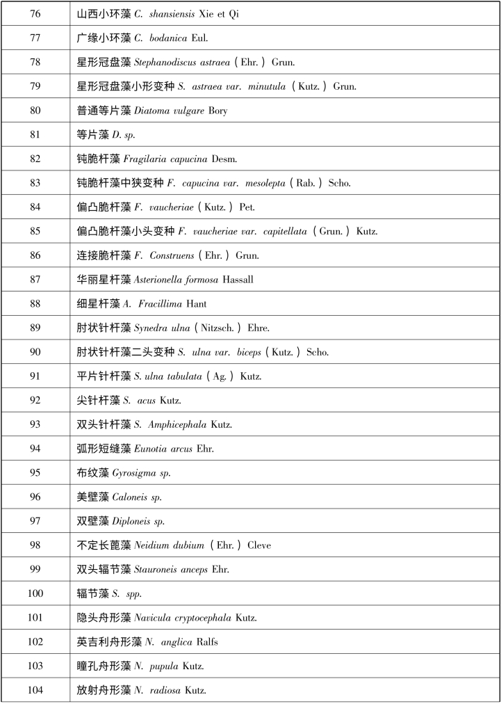 据初步分类鉴定,云南小湖泊藻类共有8 门85 属220 种,其中,绿藻门30 属86 种;硅藻门27 属65 种;蓝藻门19 属48 种;裸藻门3 属7 种;甲藻门2 属6 种;金藻门1 属4种;隐藻门2 属6 种;黄藻门1 属1 种。云南小湖泊藻类名录见表5 -2。
