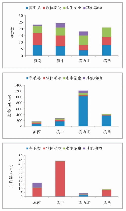 图5-10 云南不同区域湖泊底栖动物种类数、密度和生物量比较