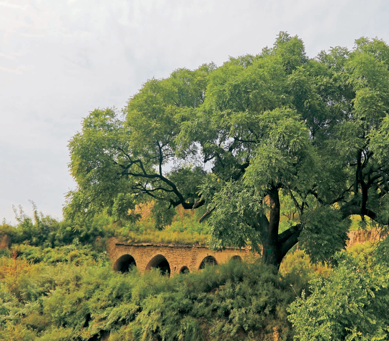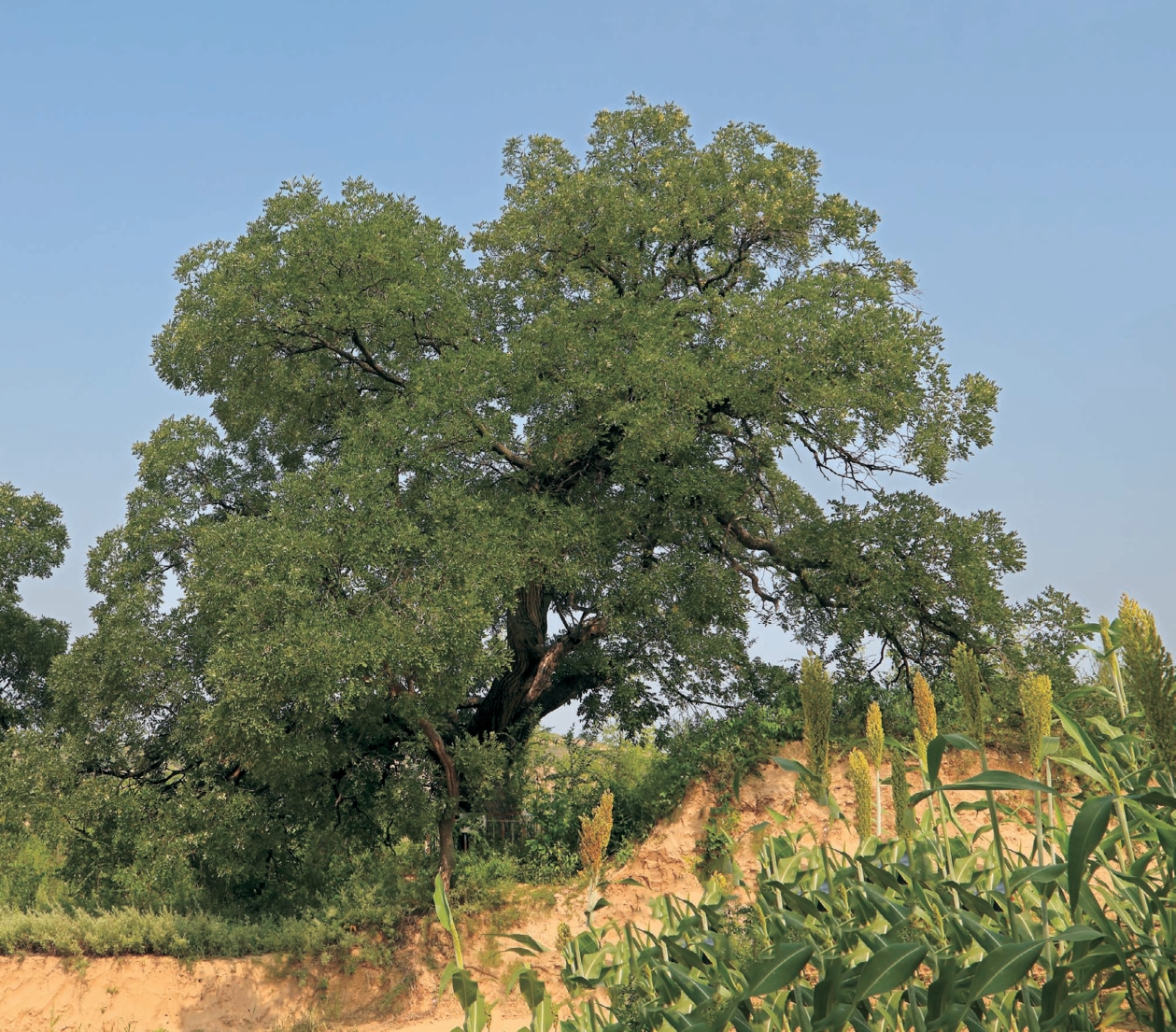 此树生长在佳县大佛寺乡后坬村槐树坬北坡。1.5米处分四杈,分枝树洞内常年停留帝黄蜂,路人不敢靠近,冠大如伞,枝叶茂密。