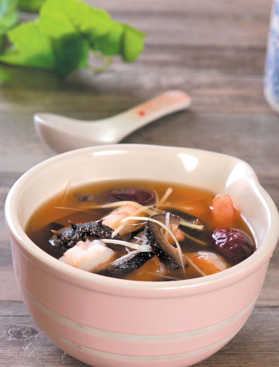 2.海参、鲜虾、木耳放入锅中,加水没过食材,煮沸后转小火炖30分钟至海参烂熟,出锅前撒上葱丝,放入大枣,加适量生抽、胡椒粉、精盐即可。