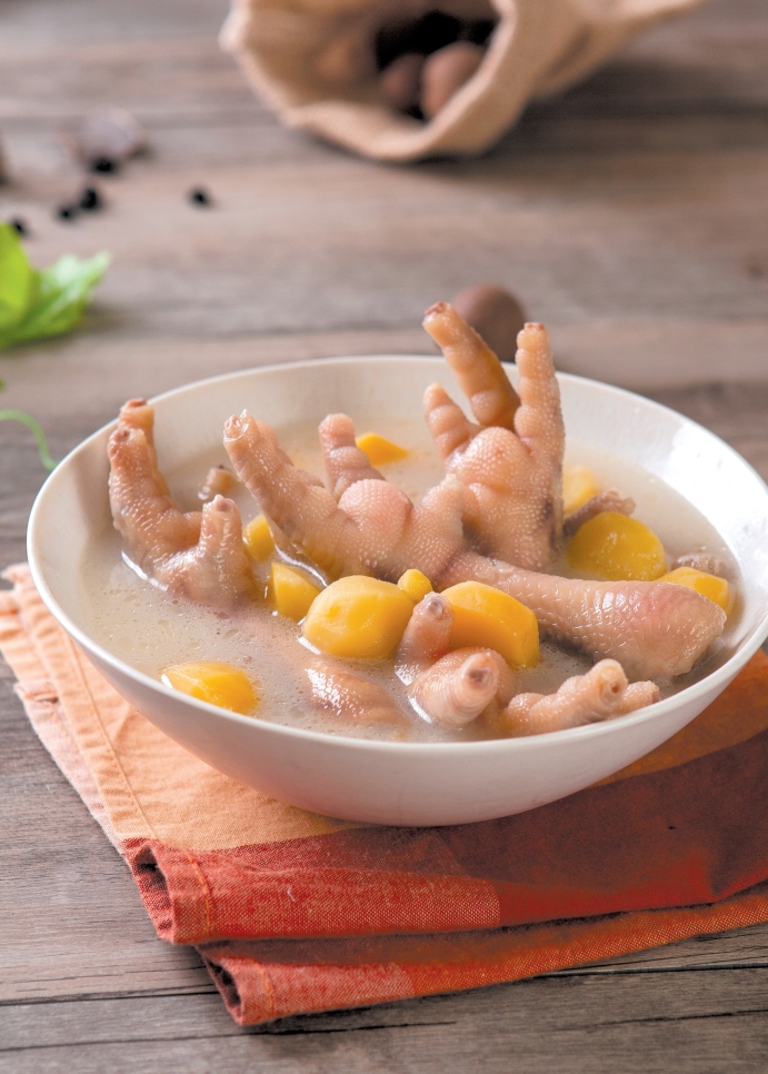 1.鸡爪洗净,剁去爪尖;板栗剥皮;杜仲、五味子洗净,装入纱布包。