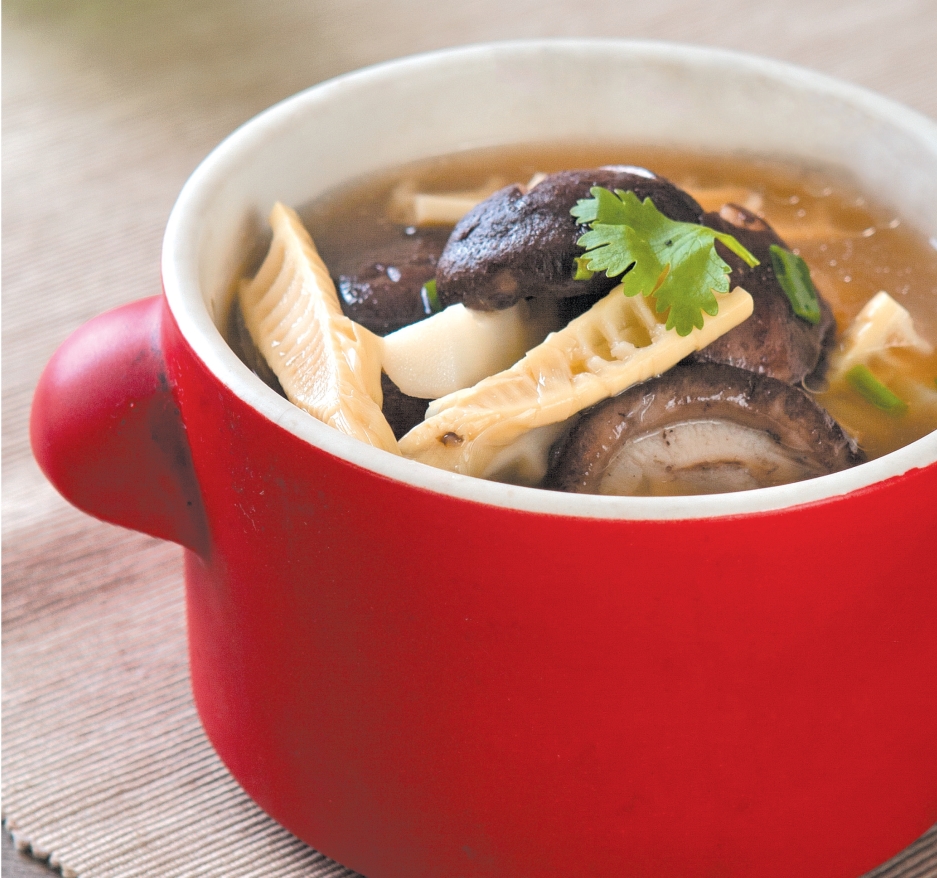 这道汤可帮助消化、防止便秘。春笋搭配香菇一同食用,鲜味十足。