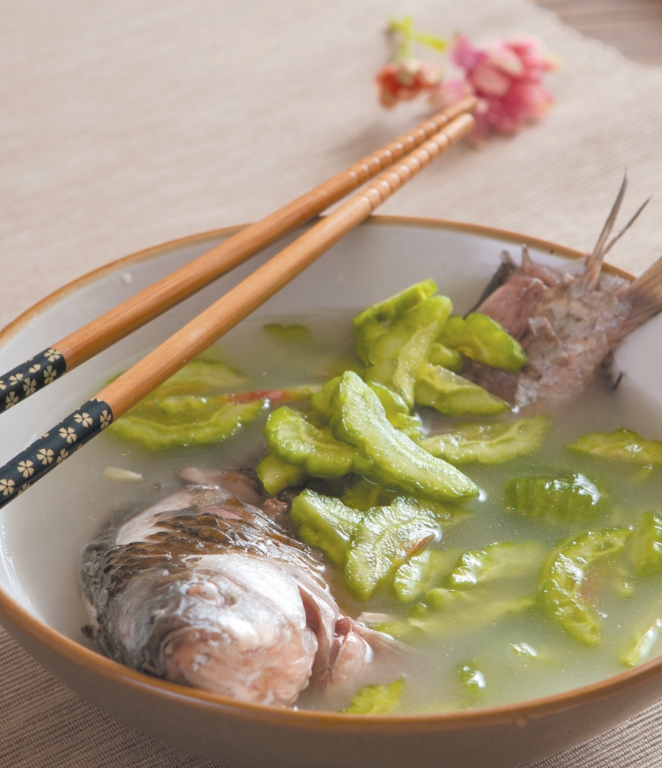 1.鲫鱼洗净,刮去腹内黑膜;山药去皮,洗净后切成块,浸泡;苦瓜切成片。