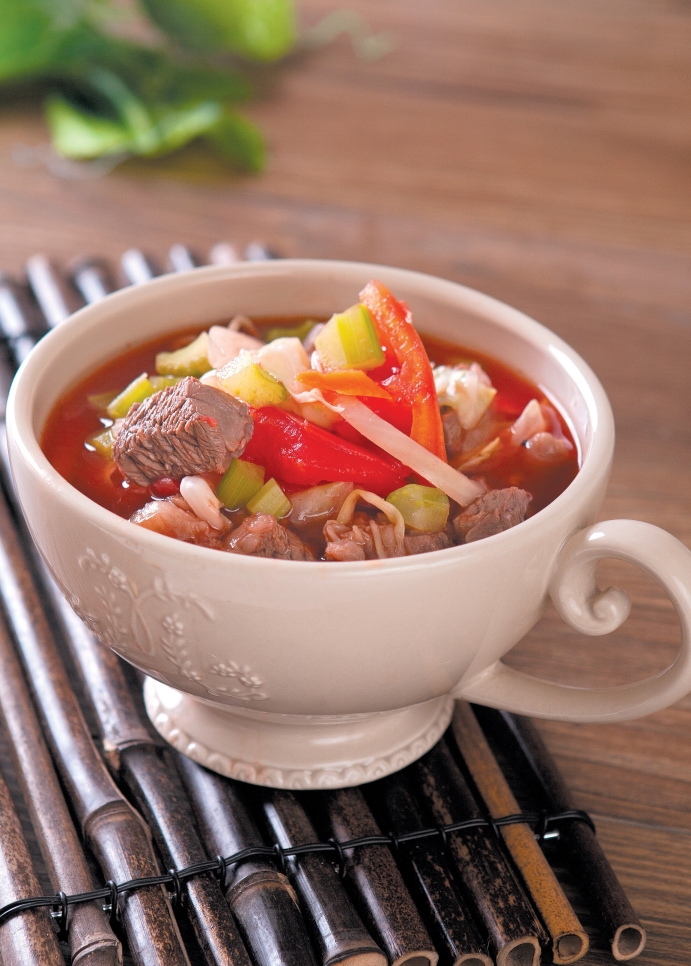 食材中有牛肉,其味甘性温,是温中补虚、滋养益气、培补脾胃之品,又加了各种蔬菜,营养丰富。经常食用此汤可增强免疫力、补虚强身、健胃消食。