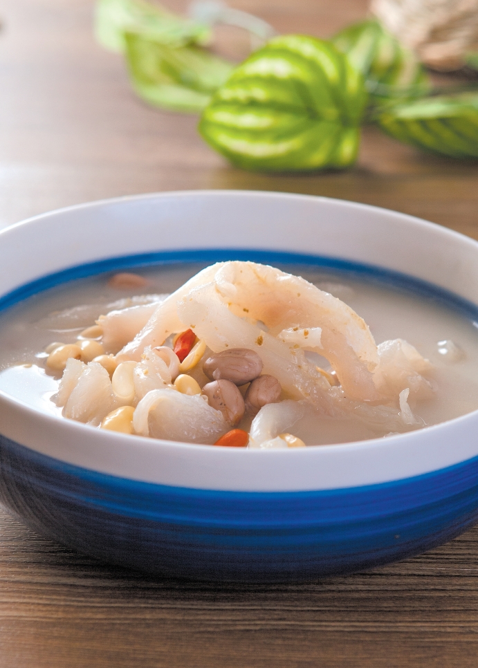 2.锅置火上,倒入适量清水,放入猪蹄筋、花生、黄豆,大火烧开后转小火炖2小时,加入枸杞子、田七粉再煮10分钟,出锅前加适量料酒和精盐调味即可。