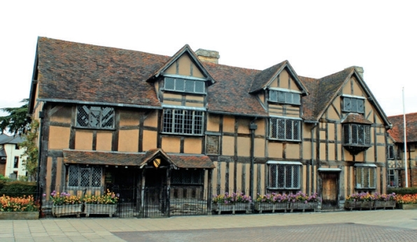 莎士比亚就是在这片土地和河流旁长大的。镇上的每一条街道,每一家书店,每一座雕塑,都有莎士比亚的名字。他的故居是这个小镇的心脏。这是一幢带阁楼的两层民居,用橡木搭建框架。框架之间填以石砖,然后抹上泥灰。这种泥灰是用麦秆、牛毛和黏土混合而成的。框架上涂着黑漆,泥砖墙刷上了白石灰,木架与墙面形成黑白对比效果。这是都铎时期的建筑风格。因长期风吹日晒,墙壁变成了灰褐色。粗大的橡木露出了原木纹理。屋顶上铺着红褐色的瓦片。当地有关部门还依据零星史料,重建了莎士比亚妻子安妮·海瑟薇的祖屋(Anne Hathaway’s Cottage)、女儿女婿的荷尔农庄(Hall’s Croft)、孙女婿的纳什居所(Nash’s House),并对莎士比亚最后居住的新坊(New Place)遗址,进行了考古发掘和保护。