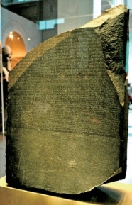 大英博物馆的镇馆之宝是埃及馆入口处的罗塞塔石碑(Rosetta Stone),高1.14 米,宽0.73 米,制作于公元前196 年。一块石头上,刻上了一段文字,成了解读历史的钥匙。这就是文字的力量。石碑上用三种文字镌刻了古埃及国王托勒密五世登基的诏书,最上面是14 行古埃及象形文,中间32 行是埃及通用文字,再下面是54 行古希腊文。当时的埃及臣服于希腊的亚历山大帝国,这就是碑文上有古希腊文字的原因。通过文字对比,考古学家就可以解读一直被视为“天书”的古埃及象形文字。这块罗塞塔石的来历十分曲折。拿破仑率领的法军在1799 年占领了埃及,一位法军上尉在尼罗河三角洲上一个称为罗塞塔的港口发现这块石头。法国军官认为这块黑色玄武岩石有研究价值,遂按其发现地被命名为罗塞塔石碑。 1801 年,拿破仑的军队被英军打败投降。法军在撤退时,将罗塞塔石碑藏在一艘小船上,企图运回巴黎,却被英军截获。罗塞塔石碑在1802 年时运抵英国,并且以英王的名义捐献给大英博物馆作为收藏,成了镇馆之宝。