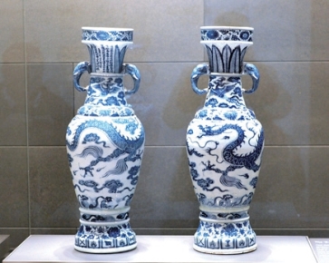 展品中依然有很多疑团,漂浮在历史与想象之间。那种感觉如同我乘飞机时俯瞰大地一样。白云下面有蜿蜒的公路,汽车像甲壳虫一样爬动。汽车窗玻璃反射出一道阳光,如同向空中发射出的信号。我的目光锁定了一辆红色轿车,跟着它移动了一会儿,直到被云彩遮挡住。我不知道汽车里坐的是谁?他们的国籍?他们此刻的心情?我在博物馆里常涌起这种焦虑和渴求。每件展品的诞生都有一个故事,这些失落的故事便成了历史秘密,需要研究者去耐心破解。95 号展厅的入口处是一对青花象鼻耳瓶。这对瓷瓶原供奉于北京智化寺。大卫·博西沃爵士在1927 年收到其中一只,8 年后买到了另一只,使之复合成双。1929 年,英国学者霍布逊(R.L.Hobson)发现青花云龙纹象鼻耳瓶上有“元至正十一年”的字样。他的发现推翻了中国人“元代无精品青花”的说法。1952 年,美国弗瑞尔艺术博物馆(The Freer Gallery of Art)研究员亚历山大·波普,以这个青花云龙纹象鼻耳瓶为“标准器”,对伊朗和土耳其的馆藏中国青花瓷进行了排比分析,查找到74 件特征相同的青花瓷。他撰写的《中国14 世纪青花瓷》,将中国青花瓷器的鼎盛岁月提前了一个朝代。