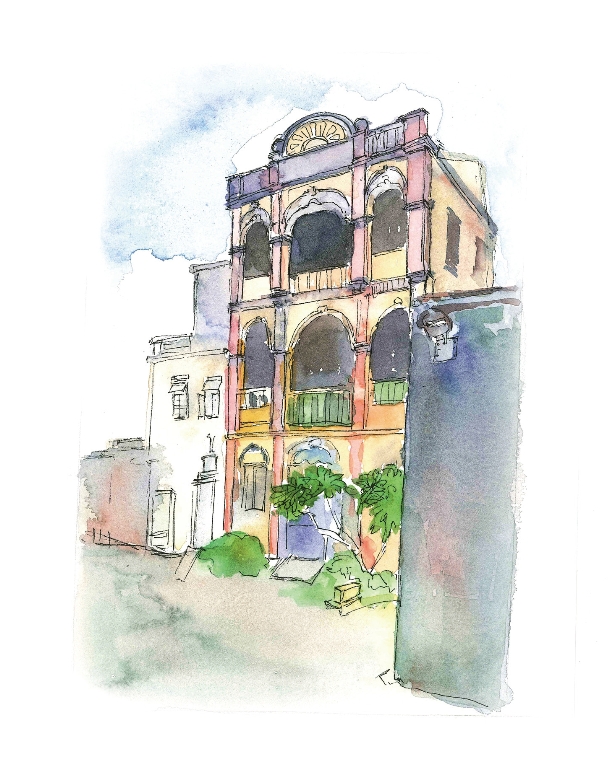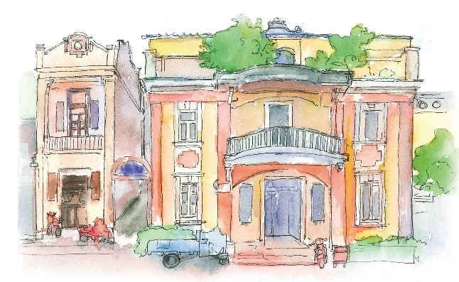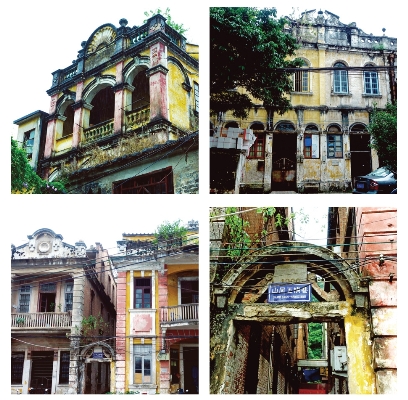 在街内,你会发现几座色彩斑斓的建筑,其中建于民国时期的山凤街13号是最浓墨重彩的一座。这座三层高的西式建筑糅合了西方古典与南洋风格的元素,是典型的“西洋风”。用色浓重大胆、热情奔放,暗红色的柱子,鹅黄色的墙面,两色相间,搭配精巧,艳丽夺目,饰以翠绿色的陶瓷瓶状栏杆、象牙白的拱券,丰富变幻,相得益彰。三个楼层均为柱廊门楼设计,似一排洞开的大门。券心石为卷状,活像孔武有力的狮足。