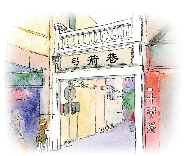 弓箭巷名字的由来,据说是因为其形状如拉满的弓。弯弯的小巷是有那么点意思,其饱满的弧度足够叫人联想,但这仍需考验刚到的游人丰富的想象力。反正我很喜欢这个名字。