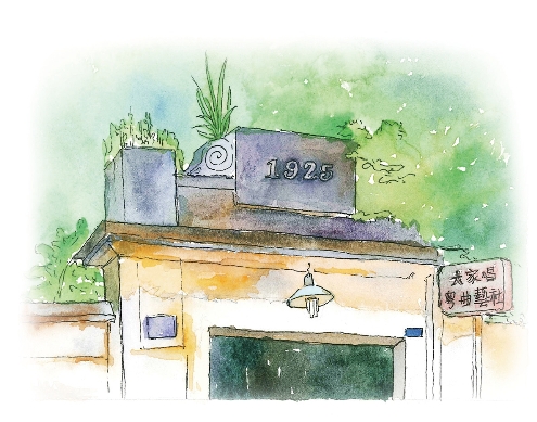 弓箭巷12号门前悬挂着一块招牌,已经发黄变旧,不知道还能否插电点亮,一面写着“有嘢唱,音乐曲艺社”,一面则是“大家唱,粤曲艺社”,昭示着它现在的功用。大门上有一块记录建造年份的石雕牌匾,写着“1925”。下方悬挂一盏路灯,粉蓝色的灯罩与白灰外墙相当匹配。
