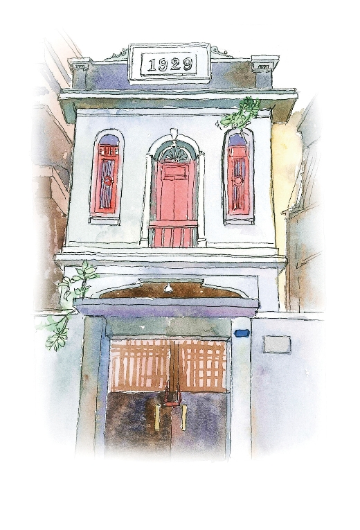 弓箭巷6号老宅保存得十分完好,听说是一郑氏家族兴建的。除了前院锈迹斑斑的铁门,独具民国风味的宅子十分光洁,也许是新近修缮过。修长的拱顶形门和窗有一种文艺范,让人有置身民国电影里的感觉,仿佛随时会有一位身穿天蓝色旗袍、配过膝黑裙、手抱线装书的女学生与我擦身而过。枣红色的门窗样式简单雅致。门框与窗框以麻石筑造,呈象牙白,依旧鲜亮,没有丝毫缺损或熏黑。唯一突兀的是右窗楣处从内生长出的一棵小树,因在高处,我辨别不出它的树龄与品种,从枝叶的生长程度看来,想必有些时日了。在窗檐内侧生长,按理雨水很难进入,它是靠着什么延续生命的呢?真让人摸不着头脑啊。
