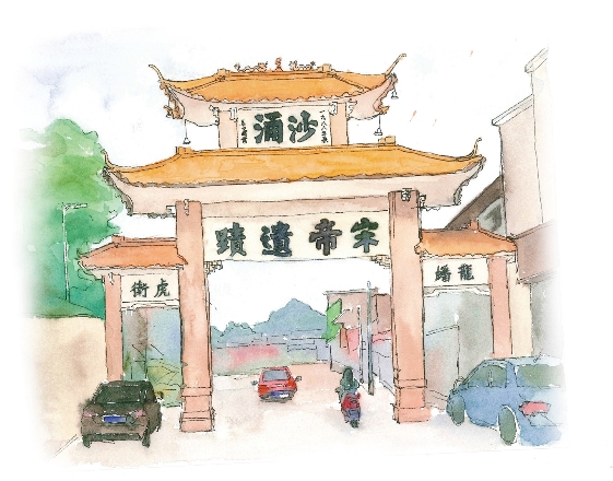 穿过恒美牌坊,不远处就是沙涌村赫赫有名的牌坊了。赫赫有名的是牌坊的前身,现在的牌坊并非旧物,而是后来重建的。在一众理发店、快餐店、药房、工厂之间,沙涌牌坊就这么雄伟地矗立在那里。牌坊为四柱三间结构,歇山顶,四柱饰回形纹托脚,橙色琉璃瓦顶。二楼正面阴刻“宋帝遗迹”,背面阴刻“侍郎故里”。重建的牌坊是由原来分开的两座牌坊——“宋帝遗迹”牌坊与“侍郎故里”牌坊合并而来。据说,当年南宋工部侍郎马南宝(沙涌村人)为救宋帝,倾尽了所有家财。于是,后人立起了“侍郎故里”牌坊以纪念其事迹。