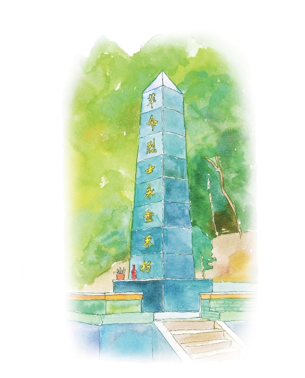在槟榔山村村口,“槟榔山战斗十烈士碑”被莹绿色的溪水环抱着
