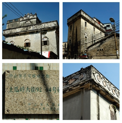 锃亮的不锈钢门配着贴小瓷砖的门柱,与寻常现代的小房无异,门边却挂着一块“中山市不可移动文物”的花岗岩铭牌,还有并排的两块蓝底门牌——土瓜岭大街94号和土瓜岭大街92号。紧锁着的大门后是一对少见的连体碉楼。两幢碉楼都在窗子旁边与楼顶围栏处留有枪眼,其中几个为了阻挡风雨,已经被堵上。碉楼的顶部围饰着菱纹和圆盘状纹式,间或有花卉的雕饰,像是一圈轻灵的花冠。楼顶用以连接两幢楼的小桥外装饰有一朵山茱萸花浮雕,正是这一小桥,使这两幢碉楼突立于众。