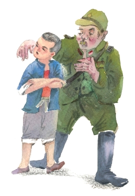 鬼子把脸上的横肉丝堆起来,露出满口金牙,做个鬼脸,温和地向雨来说:“害怕的不要!小孩皇军大大的爱护!”说着就用日本话叫人给他松绑。