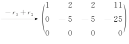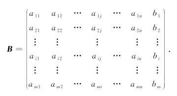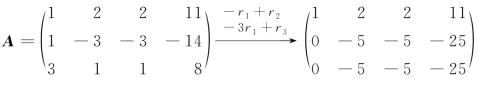 增广矩阵B的前三列元素组成线性方程组的系数矩阵A.显然,r(A)=3,r(B)=4,r(A)<r(B),未知数的个数为3.此时,线性方程组无解.