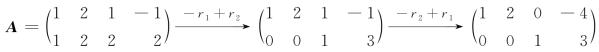 增广矩阵B的前三列元素组成线性方程组的系数矩阵A.显然,r(A)=3,r(B)=3,r(A)=r(B),未知数的个数为4,此时,线性方程组有无穷多解.