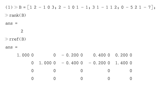 例4中用MATLAB软件求增广矩阵B的秩和简化阶梯形矩阵,更为简便.程序为