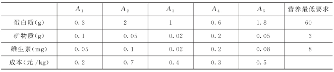 3.某公司饲养实验用的动物以出售给动物研究所,已知这些动物的生长对饲料中3种营养成分(蛋白质、矿物质和维生素)特别敏感,每个动物每周至少需要蛋白质60g,矿物质3g,维生素8mg,该公司买到5种不同的饲料,每种饲料1kg所含各种营养成分和成本见表6-19,如果每个小动物每周食用饲料不超过52kg,才能满足动物生长需要.