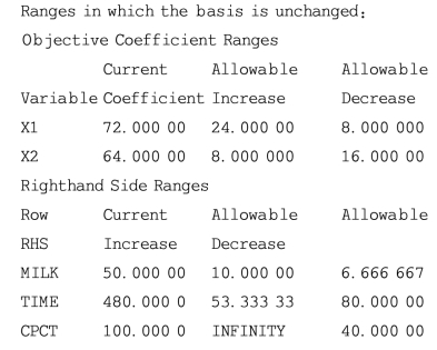 “DUAL PRICES”给出约束的影子价格(也称为对偶价格)的值:第2、第3、第4行(约束)对应的影子价格分别48.000000,2.000000,0.000000.即牛奶的影子价格为48.000000,工人的影子价格为2.000000,若用35元购买牛奶,35≤48,则值得投资,付给工人的工资最多为2.
