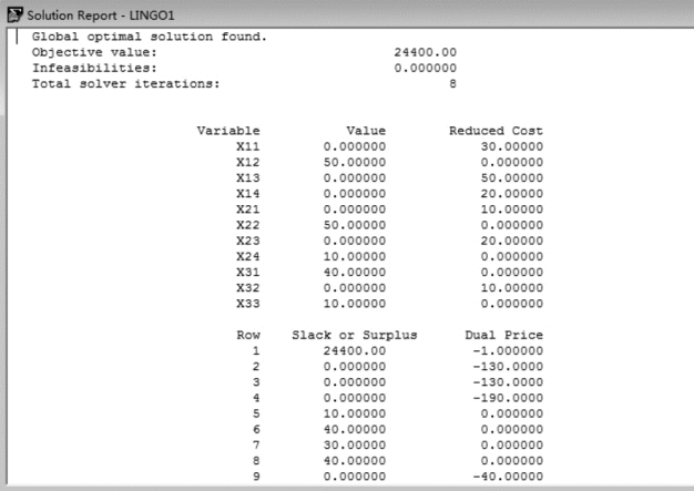 将文件存储并命名后,选择菜单“LINGO|Solve”执行,即可得到如下输出: