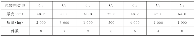1.现某物流公司准备运输7种规格的包装箱,需要装到两辆车上,包装箱的宽和高是一样的,但厚度tcm和质量wkg是不同的.见表6-16,给出了每种包装箱的厚度、质量以及数量.每辆车有10.2m的地方可以用来包装箱,载重为40t.由于地区货运限制,对C5,C6,C7类包装箱的总数有一个特别的限制:这三类包装箱所占的空间(厚度)不能超过302.7cm.