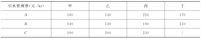 综上,送水方案为:A水库向乙区供水50kt,B水库向乙、丁区分别供水50,10 kt,C水库向甲、丙分别供水40,10kt.引水管理费为24400元,利润为144000-72000-24400=47600元.