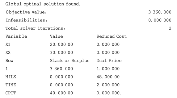 上面结果的前3行告诉我们,LINGO求出了模型的全局最优解,最优值为3360(即最大利润为3360元),迭代次数为2次.接下来的3行告诉我们,这个线性规划的最优解为x1=20,x2=30(即用20桶牛奶生产A1,30桶牛奶生产A2).
