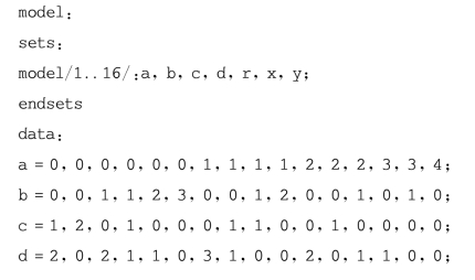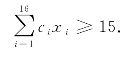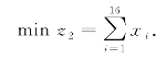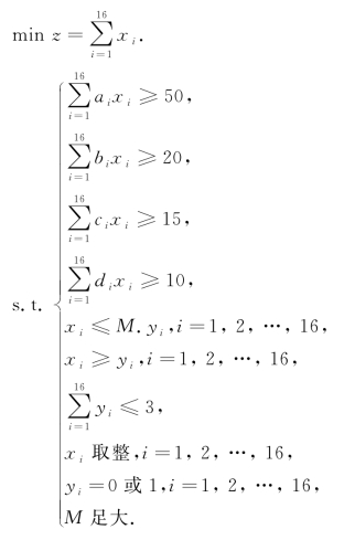 增设0~1变量yi,i=1,2,…,16.当yi=0时,xi=0,表示不使用第i种切割模式;当yi=1时,xi≥1,表示使用第i种切割模式.因此有:xi≥yi,xi≤Myi,i=1,2,…,16.其中M足够大,如这里取100.