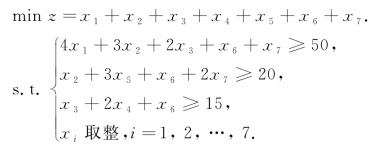 决策变量用xi表示按照第i种模式(i=1,2,…,7)切割的原料钢管的根数.以切割原料钢管的总根数最少为目标,则有