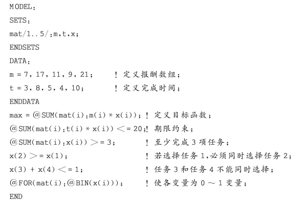 任务3和任务4不能同时选择,则x3+x4≤1,该约束表达式表明任务3和任务4至多只能选择1个.