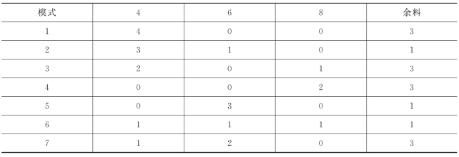 首先分析1根19m的钢管切割为4m,6m,8m的钢管的模式,所有模式相当于求解不等式方程