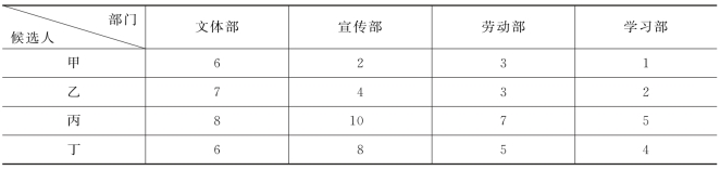 1.某校学生会准备在学生中选拔文体部、宣传部、劳动部、学习部四个部门的部长,经过层层筛选,最后剩甲、乙、丙、丁四名候选人,根据各项考核与民主测评,把四人主持各部的工作能力(量化为分值)列表见表6-24,试综合考虑四名候选人的情况,确定四个部长的最优选择方案.