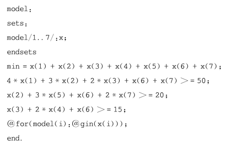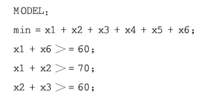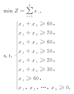 设xi为第i班应报到的人员(i=1,2,…,6),则应配备人员总数为