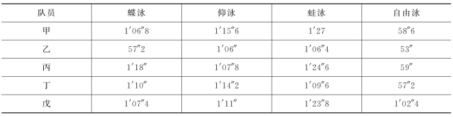 2.某班准备从5名游泳队员中选择4人组成接力队,参加学校的4×100m混合泳接力比赛.5名队员4种泳姿的百米成绩见表6-25.问:应该如何选拔队员组成接力队?