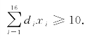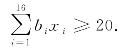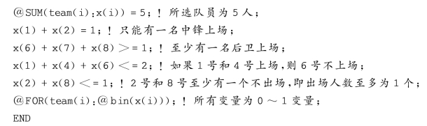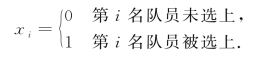 如1号和4号均上场,则6号不出场.则可用如下约束来表达:x1+x4+x6≤2.当x1=1,