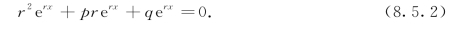 观察式(8.5.1)左端结构特点,发现其为同类型函数,而只有指数函数求导后是同类型函数,故设想函数y=erx的形式为方程(8.5.1)的解,求出y′=rerx,y″=r2erx.将其同时代入方程(8.5.1)有