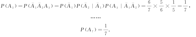 例3 (抽签问题)有一张电影票,7个人抓阄决定谁得到它,问第i个人抓到票的概率是多少(i=1,2,…,7)?