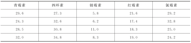 将抗生素注入人体会产生抗生素与血浆蛋白质结合的现象,以致减少了药效.表9-35列出5种常用的抗生素注入到牛的体内时,抗生素与血浆蛋白质结合的百分比.试在水平α=0.05下检验这些百分比的均值有无显著的差异.设各总体服从正态分布,且方差相同.