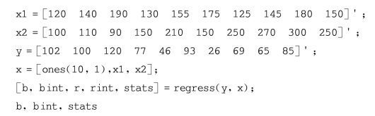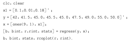 这里Y,X同上,alpha为显著性水平(缺省时设定为0.05),b,bint为回归系数估计值和它们的置信区间,r,rint为残差(向量)及其置信区间,stats是用于检验回归模型的统计量,有三个数值,第一个是R2见式(9.4.16),第二个是F见式(9.4.15),第3个是与F对应的概率P,P<α拒绝H0,回归模型成立.