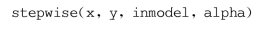 其中x是自变量数据,y是因变量数据,分别为n×m和n×1矩阵,inmodel是矩阵x的列数的指标,给出初始模型中包括的子集(缺省时设定为全部自变量),alpha为显著性水平.