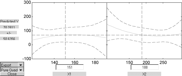 得到一个如图9-5所示的交互式画面,左边是x1(=151)固定时的曲线y(x1)及其置信区间,右边是x2(=188)固定时的曲线y(x2)及其置信区间.用鼠标移动图中的十字线,或在图下方窗口内输入,可改变x1,x2图左边给出y的预测值及其置信区间,就用这种画面可以回答例2提出的“若某市本厂产品售价160(元),竞争对手售价170(元),预测该市的销售量”问题.