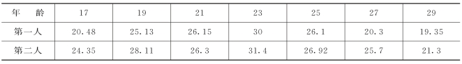 例3 将17至29岁的运动员每两岁一组分为7组,每组两人测量其旋转定向能力,以考察年龄对这种运动能力的影响.现得到一组数据见表9-38.