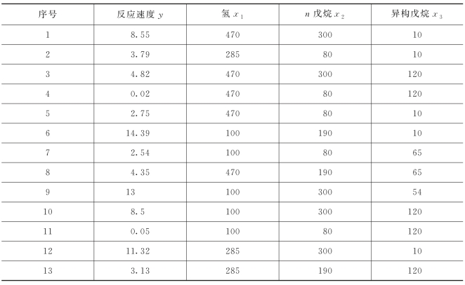 其中β1,…,β5是未知的参数,x1,x2,x3是三种反应物(氢,n戊烷,异构戊烷)的含量,y是反应速度.今测得一组数据见表9-39,试由此确定参数β1,…,β5,并给出其置信区间.β1,…,β5的参考值为(0.1,0.05,0.02,1,2).