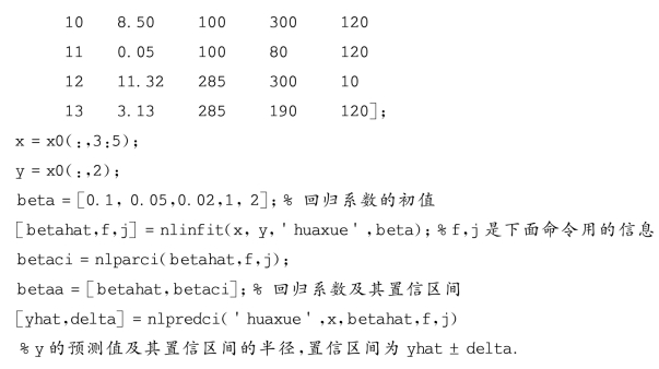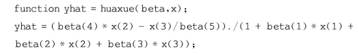 解 首先,以回归系数和自变量为输入变量,将要拟合的模型写成函数文件huaxue.m: