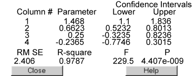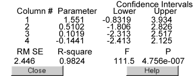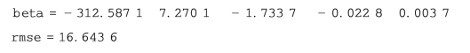 图的左下方有两个下拉式菜单,一个菜单Export用以向MATLAB工作区传送数据,包括beta(回归系数),rmse(剩余标准差),residuals(残差).模型式(9.4.24)的回归系数和剩余标准差为
