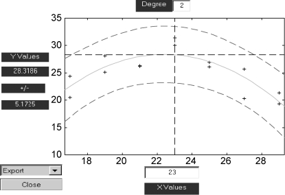 用polytool(x0,y0,2),可以得到一个如图9-4的交互式画面,在画面中绿色曲线为拟合曲线,它两侧的红线是y的置信区间.你可以用鼠标移动图中的十字线来改变图下方的x值,也可以在窗口内输入,左边就给出y的预测值及其置信区间.通过左下方的Export下拉式菜单,可以输出回归系数等.这个命令的用法与下面将介绍的rstool相似.