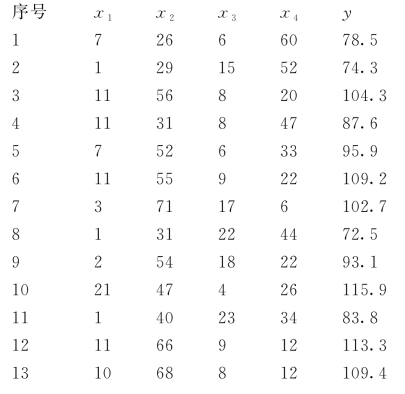 例5 水泥凝固时放出的热量y与水泥中4种化学成分x1,x2,x3,x4有关,今测得一组数据如下,试用逐步回归来确定一个线性模型